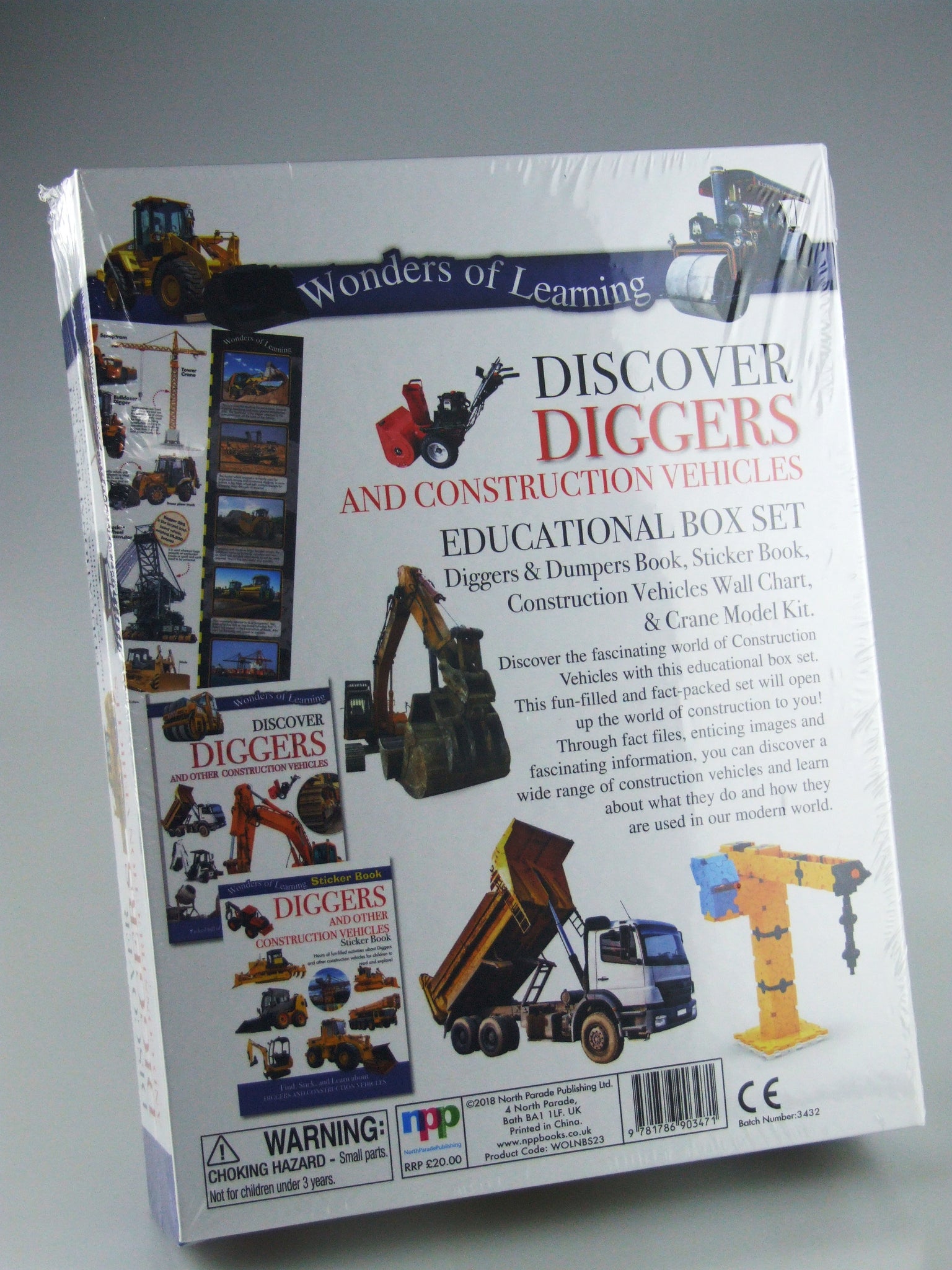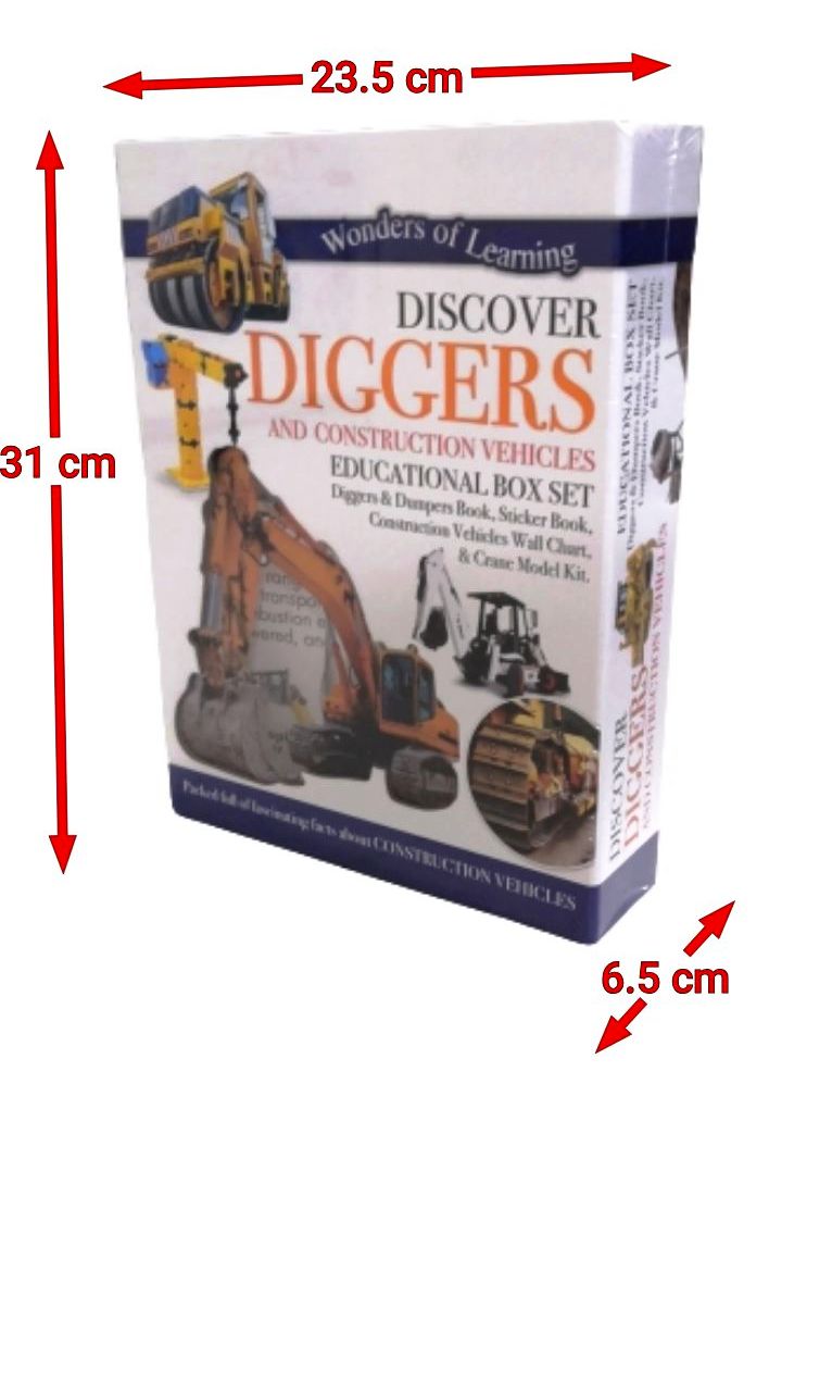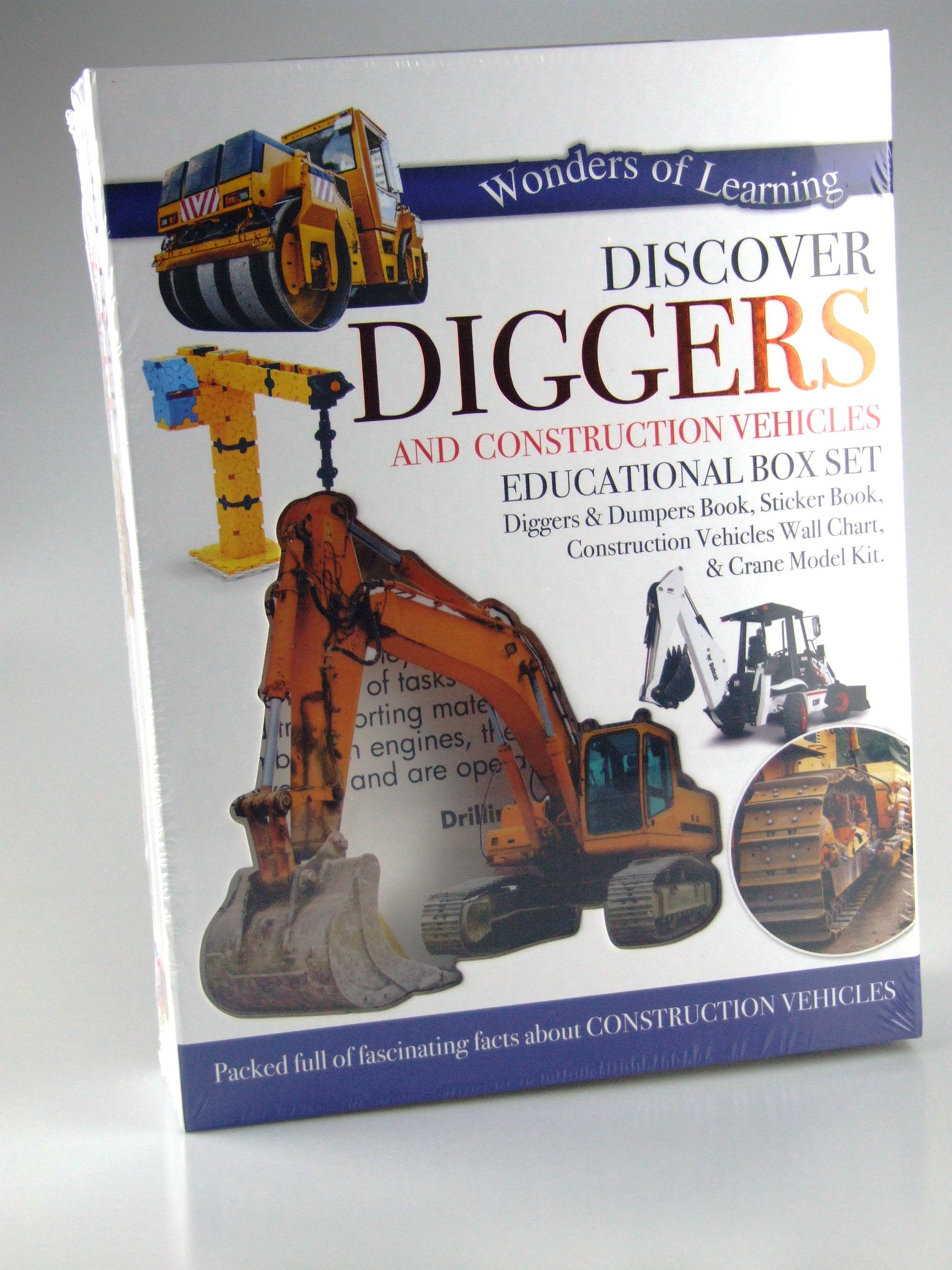 The set contains diggers & dumpers book, sticker book, construction vehicle wall chart and a crane model kit