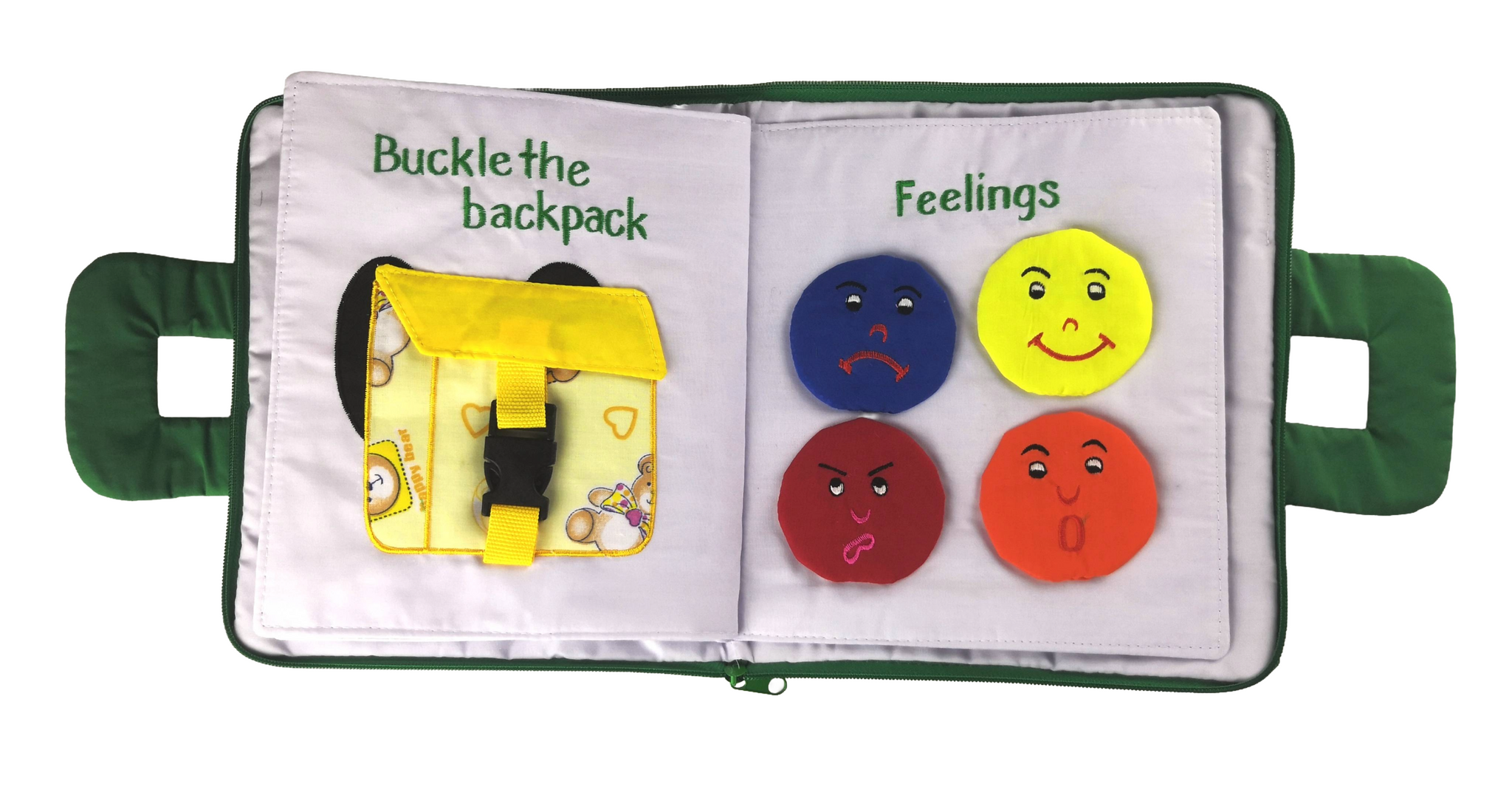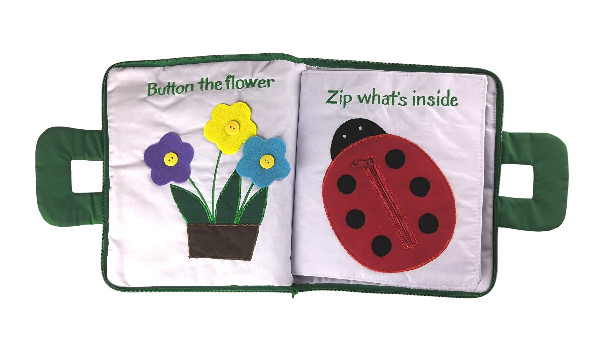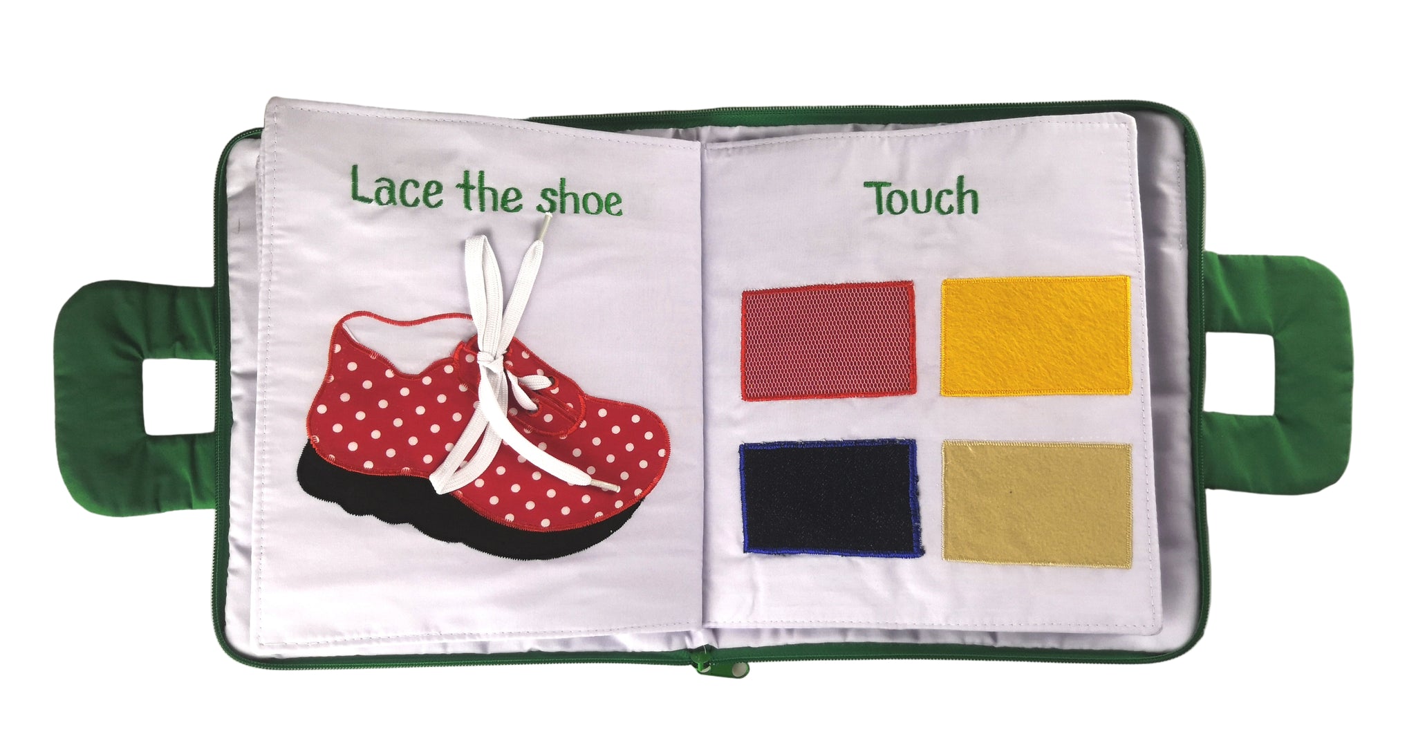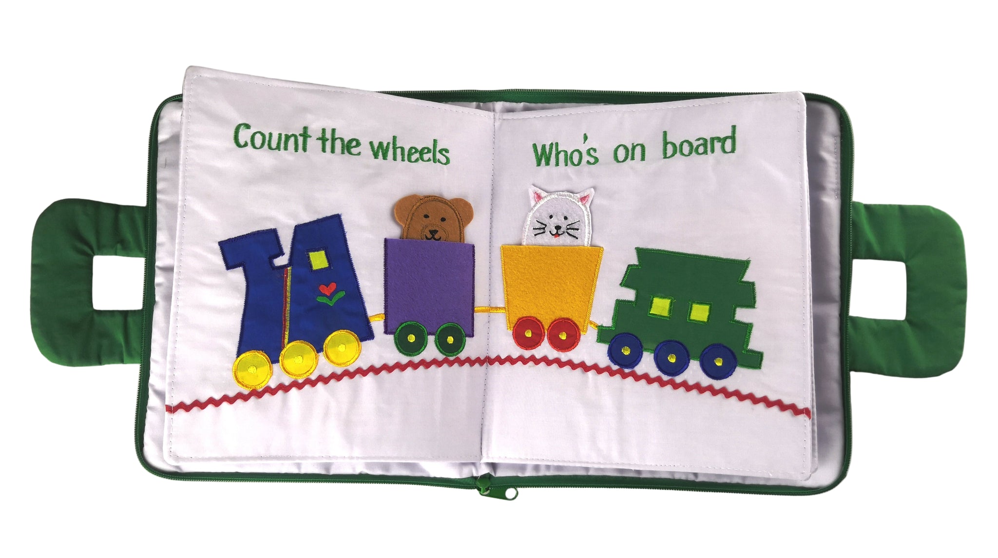 This is a zip up, screen printed cloth book which features practical learning activities for preschoolers. An excellent toy for traveling or even just to a restaurant.