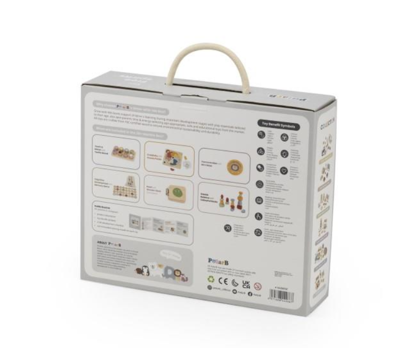 Grow-with-Me boxes support children's learning during important development stages with play essentials tailored to their age, also save parents time & energy selecting age-appropriate, safe and educational toys from the market.  All toys are crafted from FSC-certified wood to ensure environmental sustainability and durability.